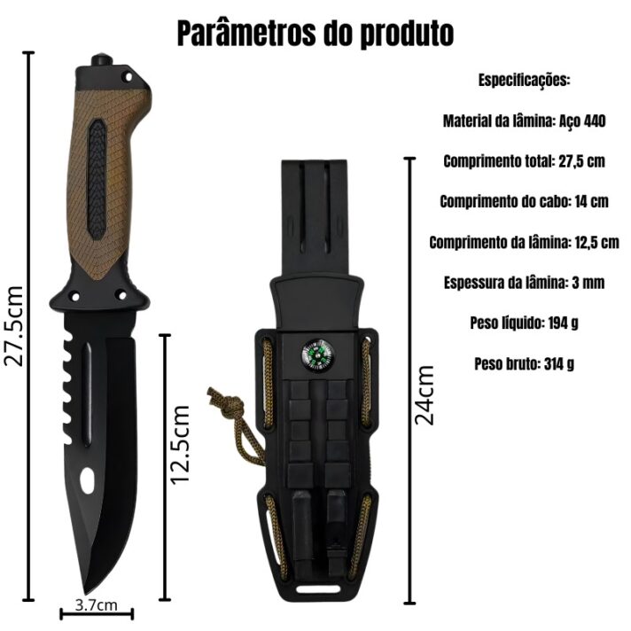 Faca Tática 27,5cm Aço 440 c/ Serrilhado no Dorso e Cabo Emborrachado c/ Quebra Vidros+ Bainha com Bússola e Pederneira GK01-B