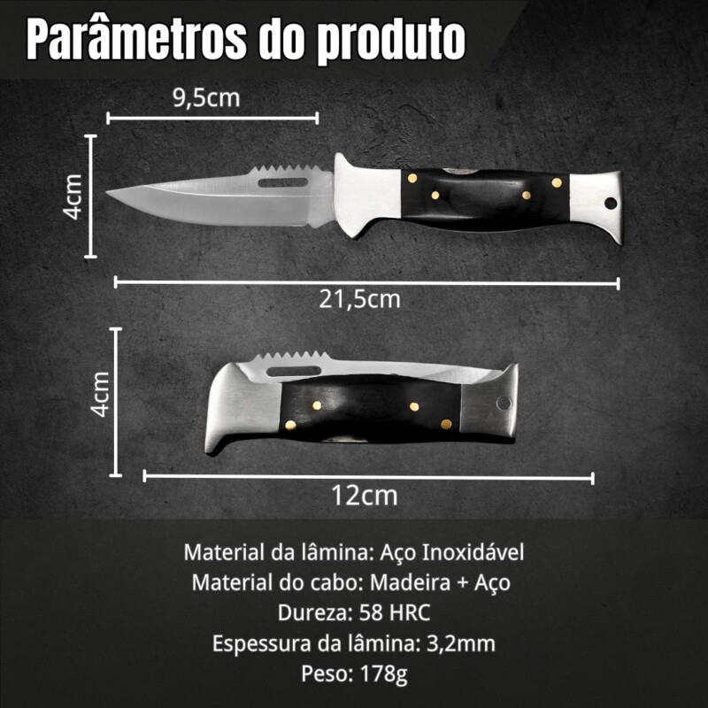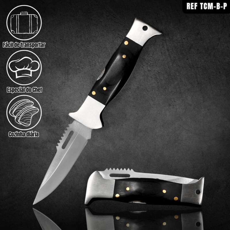 Canivete Dobrável 21,5cm Trava De Segurança, C/ Descamador de Peixe E Cabo Madeira Preto TCM-B-P