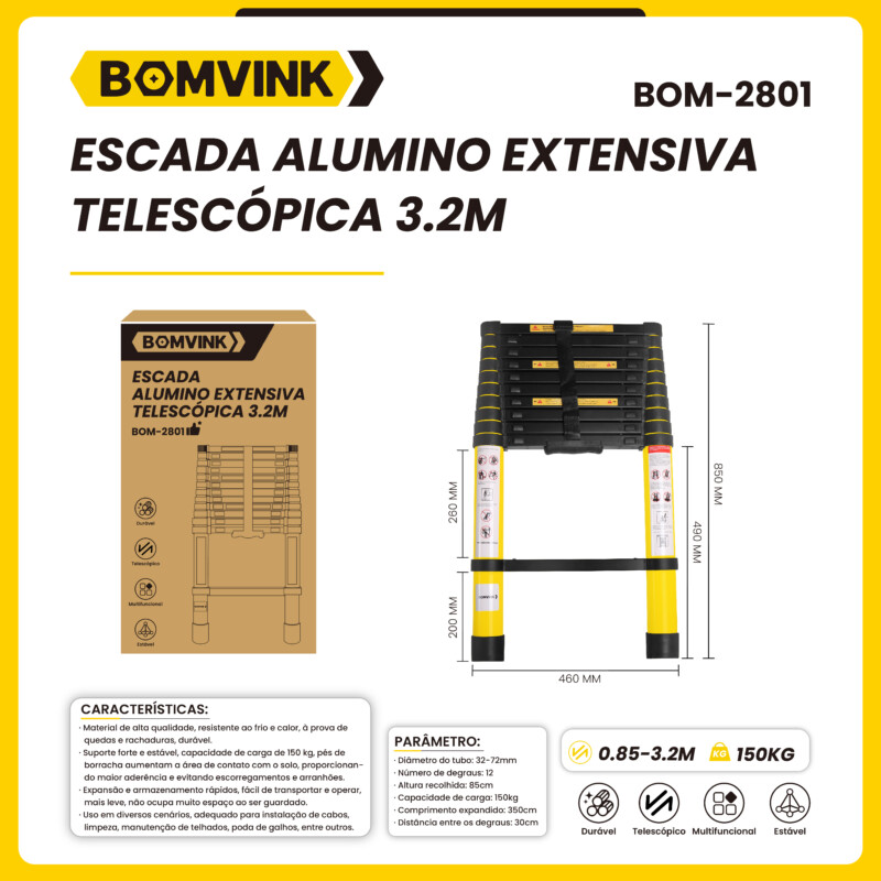 ESCADA DE ALUMÍNIO EXTENSIVA TELESCÓPICA 3.2M BOMVINK BOM-2801