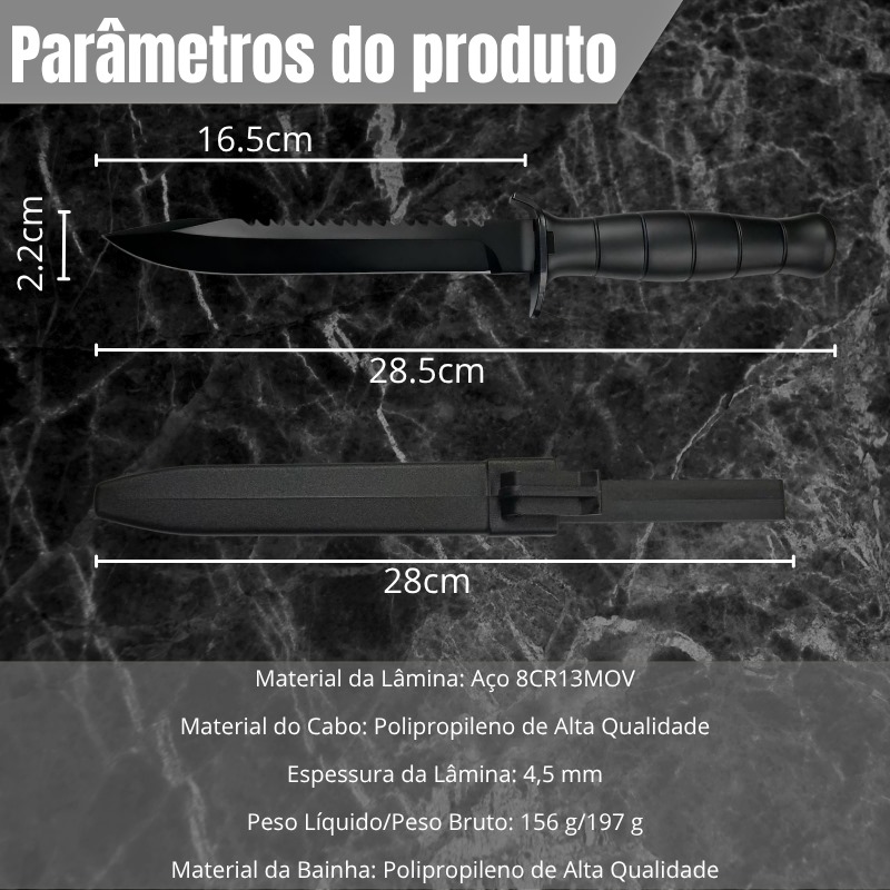 Faca Tática 28,5cm Lâmina Aço 8Cr13MoV c / Serrilhado em Dorso e Cabo de Polipropileno + Bainha GK03-B quantidade