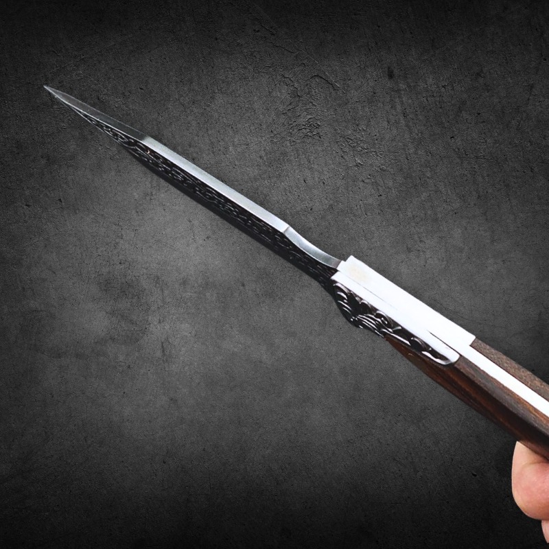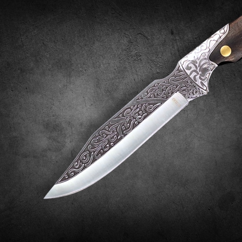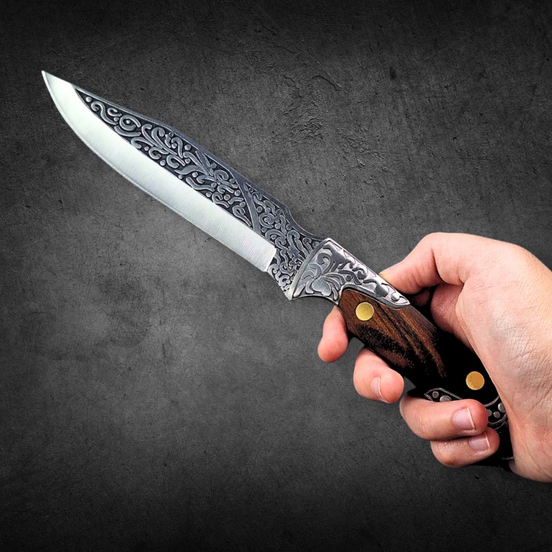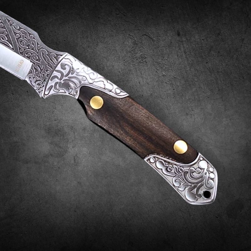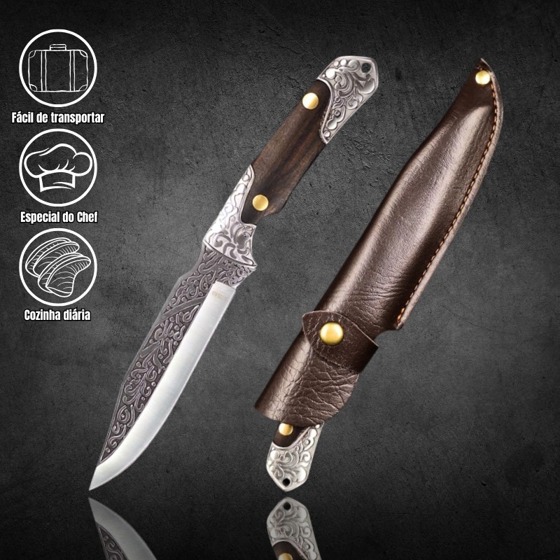 Faca Churrasco Multiuso 24cm, Relevo Arabesco Cabo de madeira + Bainha de Couro FD01