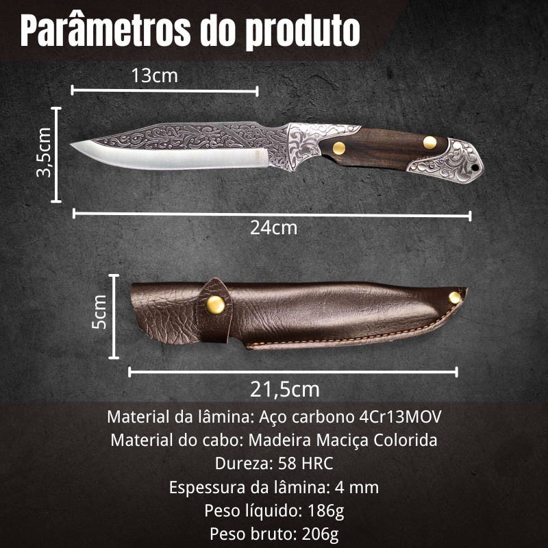 Faca Churrasco Multiuso 24cm, Relevo Arabesco Cabo de madeira + Bainha de Couro FD01 quantidade