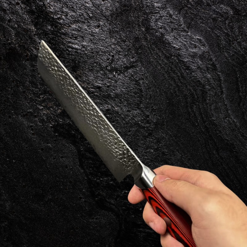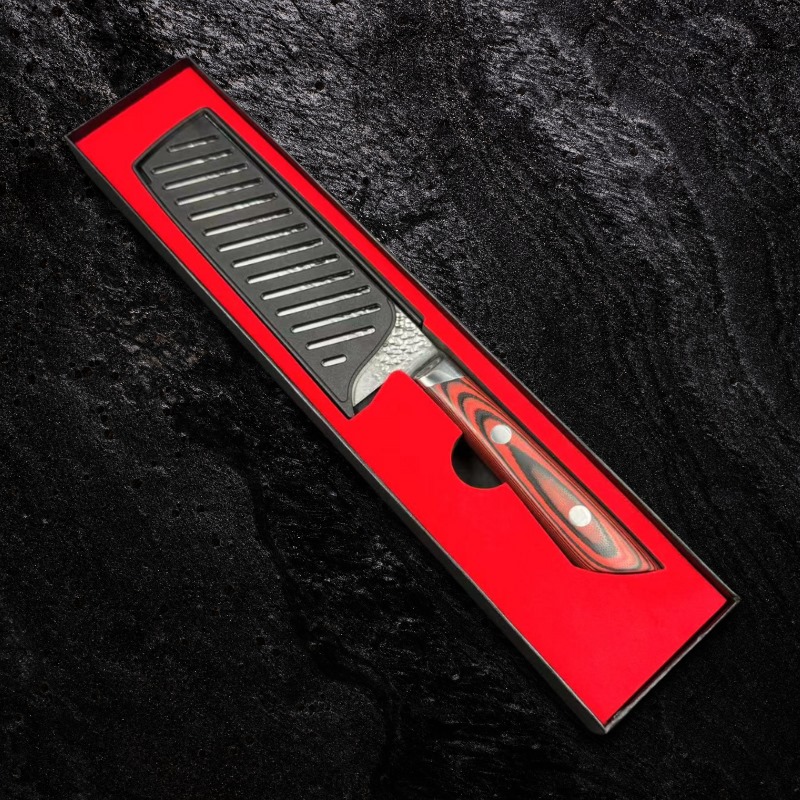 O cabo G10 vermelho e preto com pino decorativo em flor de cobre proporciona um toque sofisticado e ergonômico, além de ser antiderrapante, resistente à ferrugem, óleo e corrosão. O padrão martelado forjado com motivos Damasco não só embeleza a peça como também melhora o desempenho de corte. Uma faca pensada para quem valoriza qualidade e estilo.