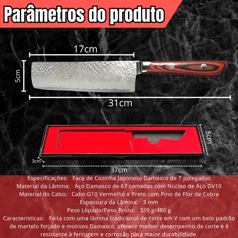 A faca CJ-174 combina tradição, elegância e alto desempenho em um único utensílio. Com lâmina de 7 polegadas em aço damasco de 67 camadas e núcleo de aço DV10, ela oferece cortes precisos e durabilidade excepcional. Seu design em formato “V” garante uma afiação superior, ideal para quem busca eficiência na cozinha.