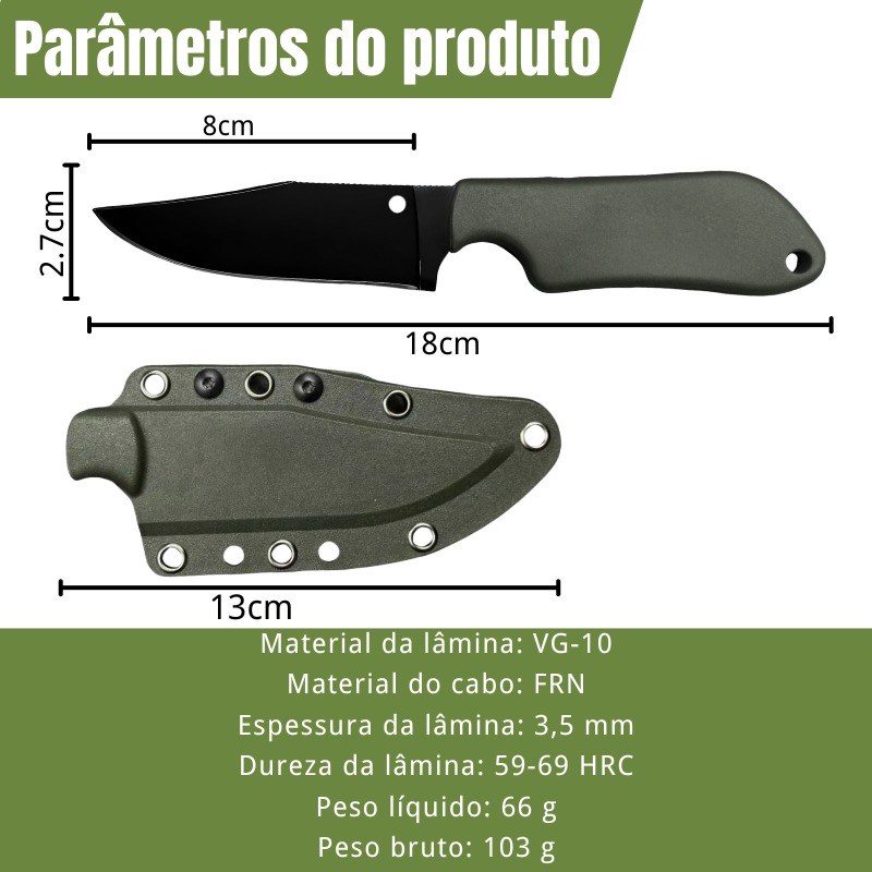 Faca Tática com Lâmina de Aço VG-10 e Cabo de FRN + Bainha Reforçada TATICA-PL-C VERDE