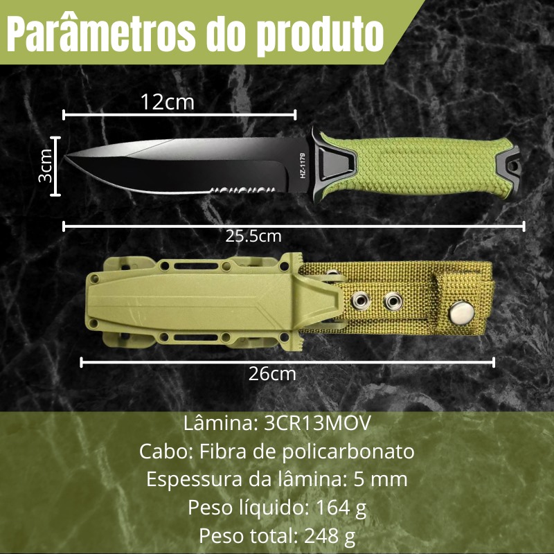 Usos recomendados: Tático, Caça, Pesca, Sobrevivência, Camping, Bushcraft, Trekkin, Hiking