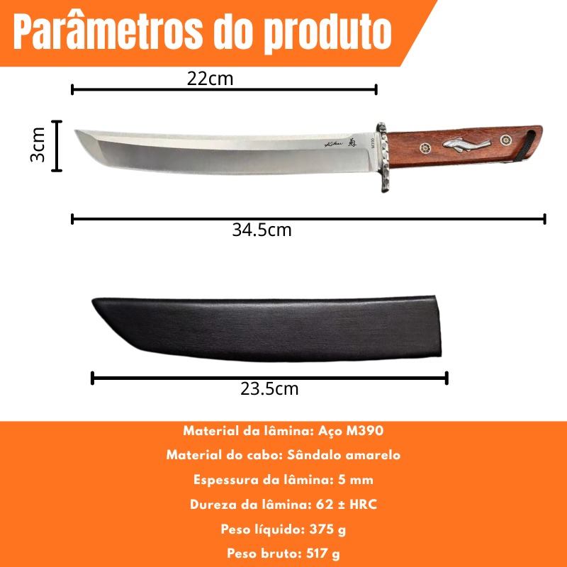 Facão Japonês Tanto Aço Especial M390 e Cabo de Sândalo Amarelo Com detalhes de Metal e Pinos de Cobre CJ-168 quantidade