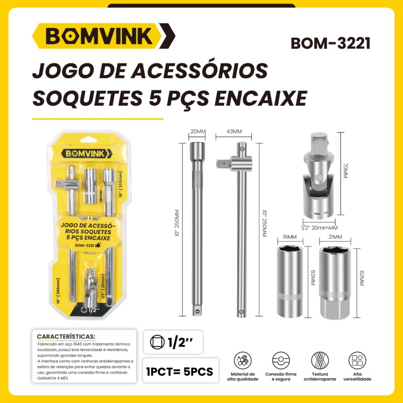 JOGO DE ACESSÓRIOS SOQUETES 5 PÇS ENCAIXE BOMVINK BOM-3221
