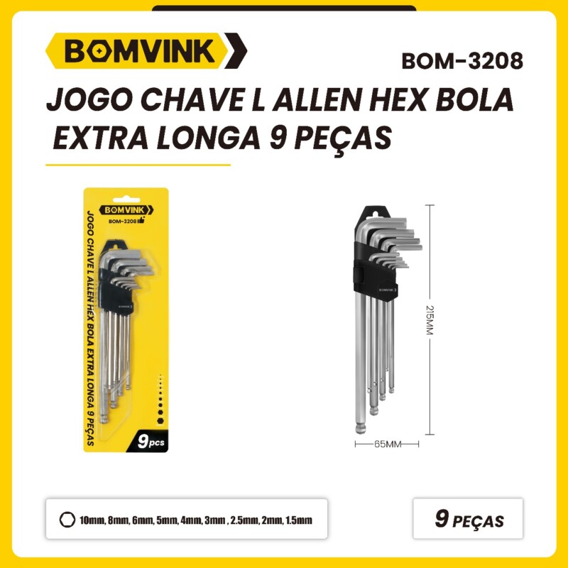 Jogo de Chave Allen Hex Bola Extra Longa, com 9 Peças. BOM-3208