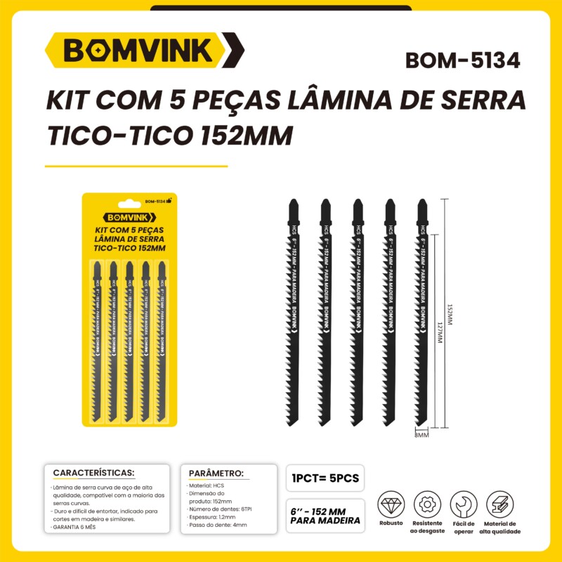 KIT COM 5 PÇS LÂMINA DE SERRA TICO-TICO 152MM BOMVINK BOM-5134
