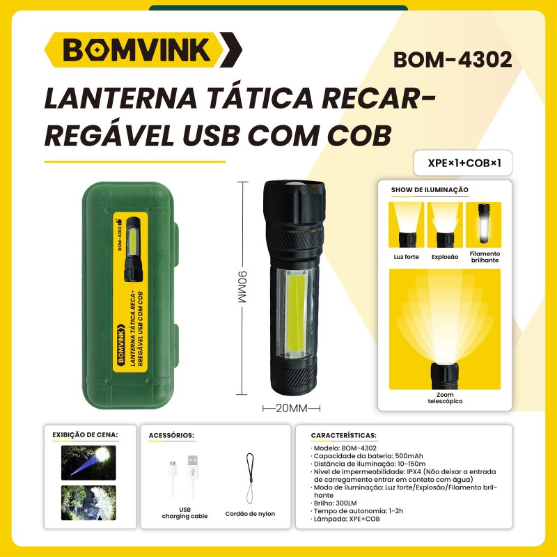 Lanterna Tática Recarregável usb com Cabo BOMVINK BOM-4302 quantidade
