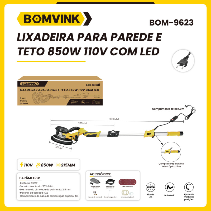 Lixadeira Para Parede e teto 850w 110v com led BOMVINK BOM-9623