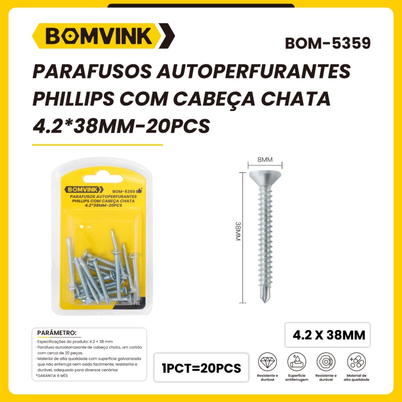 PARAFUSOS AUTOPERFURANTES PHILLIPS COM CABEÇA CHATA 4.2*38MM-20PÇS BOMVINK BOM-5359 quantidade